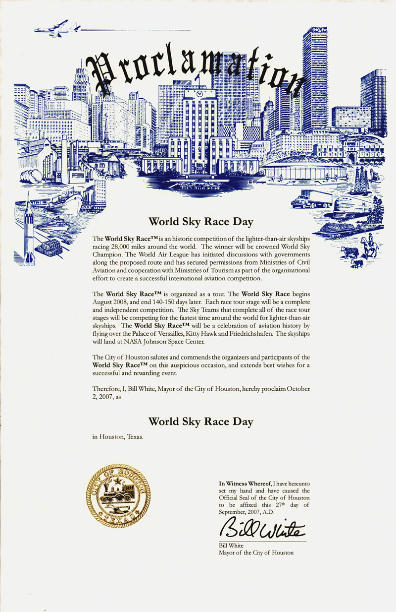 "Mayor White, Council Members, Ladies and Gentlemen, and Anne Clutterbuck, my friend for whom time has no bounds, I want to thank you for the Honor and recognition that today we take note it is in Houston – World Sky Race Day! Today, we are proud to announce that Houston has taken a leading role for hosting and participating as a milestone city in a race of zeppelins and skyships that will connect the entire world. Today, we start the countdown of history as we ready skyteams and their flying machines to compete and challenge the world’s imagination in the pursuit of an epic dream to be the first World Sky Champion. Each of us understands the pleasure of friendships, old and new. With a handshake and smile, we connect and around the world this is a universal rite for beginning, connecting and renewing friendships. The World Sky Race is about connecting the globe with the simple pleasure of watching and cheering on these, to be acclaimed, sky heroes as they seek to be the first to successfully circumnavigate the globe in a lighter-than-air skyship. With the support and friendship of the UNESCO World Heritage Centre, the World Sky Race will tell the tale of history and that of diverse cultures. Along the race route, the heritage of humanity will be represented by the iconic monuments and natural wonders of the world.
