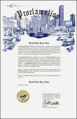 Being in Houston, this room is filled with fellow Texans, so I can freely describe the World Sky Race in the superlative terms that we of Texas all understand. This is BIG! The World Sky Race will be the largest man made event, seen by the largest number of live, and I mean live, spectators in the entire history of human race. Now this is BIG! Houston, thank you. This proclamation largely states that this auspicious day in Houston is World Sky Race Day. Now lets get out the support of our friends and our good neighbors and do something BIG. We want the world to know how Houston thinks, how Houston acts. We are BIG! Thank you, Anne. Thank you, Mayor. Above and Beyond!"
