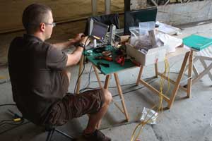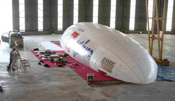 MELUN-VILLAROCHE, FRANCE - Members of the Projet Sol'R French development team provided the World Air League with the fun opportunity to review Le Nephelios under construction . Le Nephelios is a 72 feet long one man solar powered skyship. It is intended to push the boundaries of environmental technologies forward by completing a demonstration flight across the English Channel. For power, it is wrapped with flexible solar panels capable of generating 2.4 kilowatts. The electricity generated has 0 carbon emissions and is used to operate its two big red propellers. The outer hull wrap is made from nylon and polyethylene. The pilot sits in a harness and frame made of lightweight high strength composites and aluminum. The craft is estimated at being able to travel at 25mph and should take approximately an hour to cross the English Channel. In terms of man-made aviation technologies and the environment, only flying kites are greener.