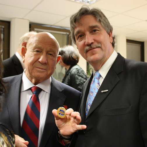 Cosmonaut Alexey Leonov and Commissioner Don Hartsell showing the WSR Challenge Coin