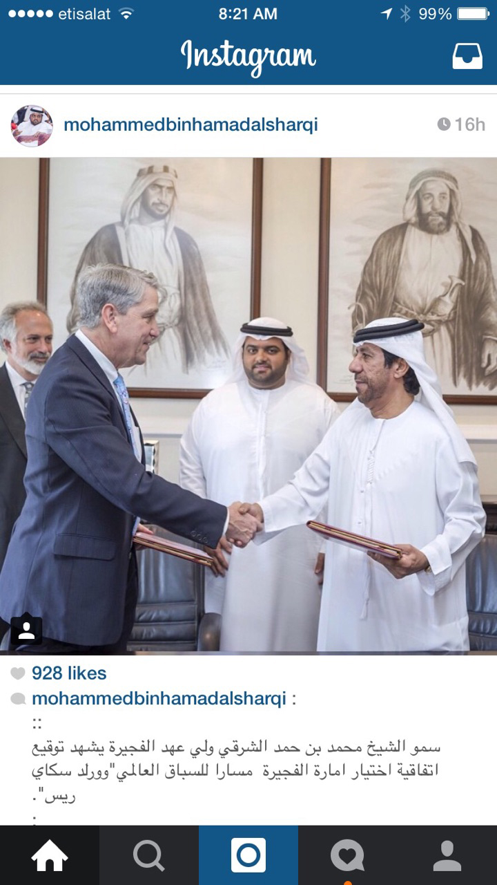FUJAIRAH, UNITED ARAB EMIRATES - HRH Sheikh Mohammed bin Hamad bin Mohammed Al Sharqi Crown Prince of Fujairah presided over the Government of Fajairah and the World Air League completing an airport agreement to host the World Sky Race. Participating in the signing ceremony, Mr. Salem Al Zahmi represented the Government of Fujairah and Commissioner Don Hartsell and Director Larry Waks represented the World Air League.